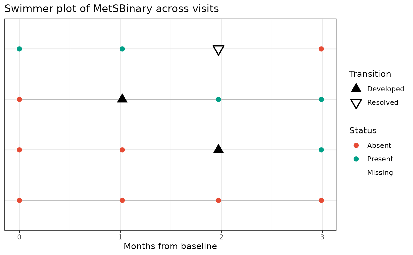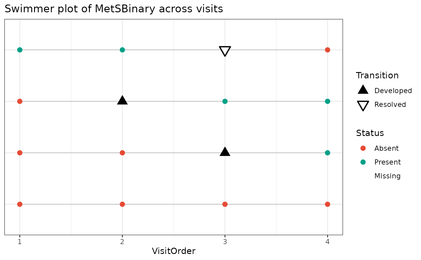 PlotSwimmerTransitions.RdCreate a swimmer-style longitudinal plot for a binary condition measured across repeated visits. The plot shows condition status at each visit, highlights transition points where the condition develops or resolves, and supports multiple participant ordering strategies for exploratory quality control, longitudinal debugging, or figure creation.
